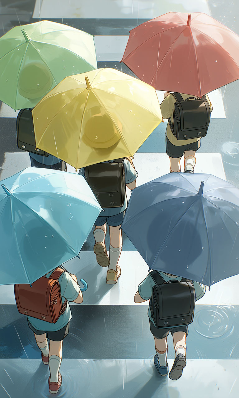 ありがとうございます。カラフルな傘とランドセルを、アジサイの花に見立てて表現しました。