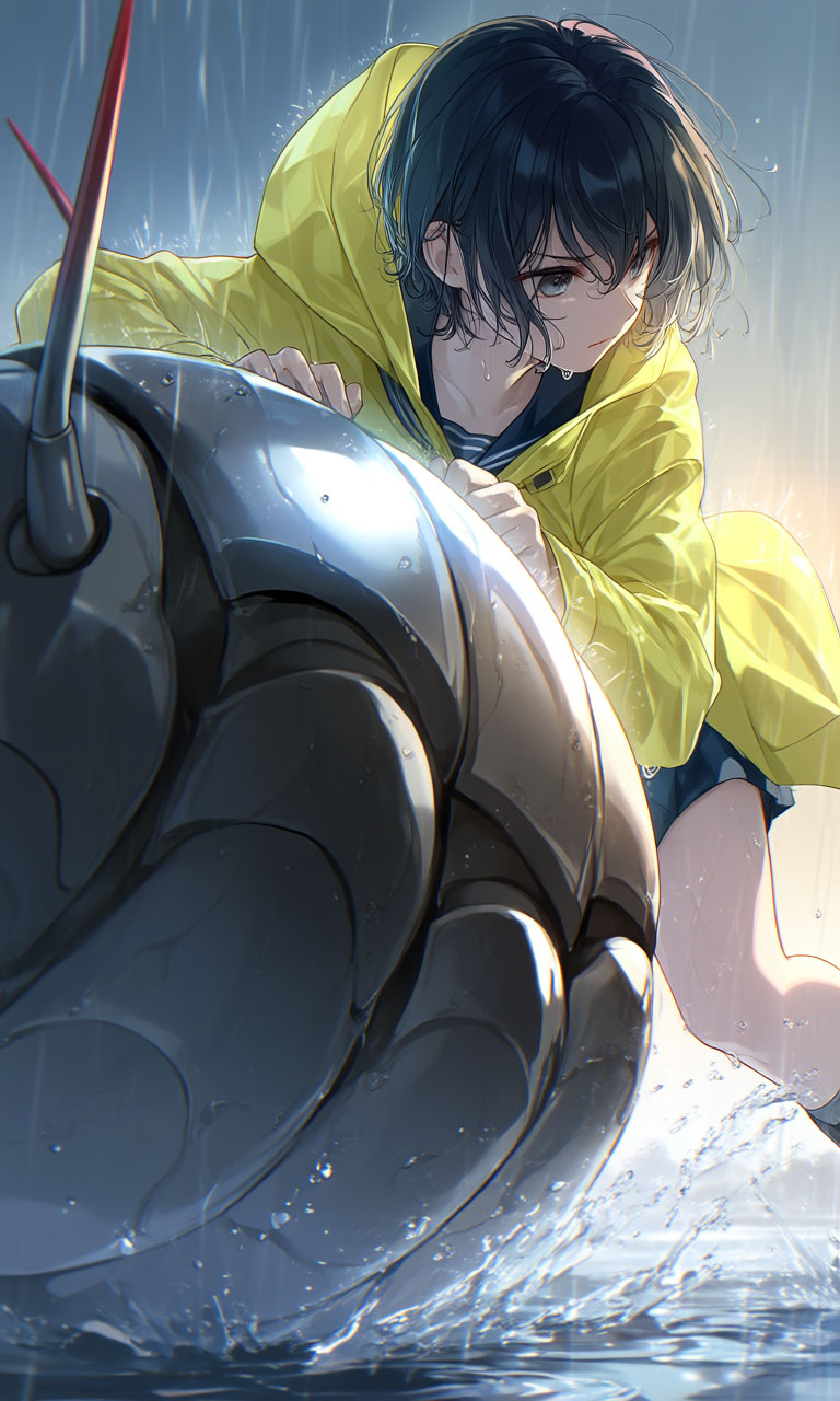 In a sudden downpour, the girl desperately rolls a giant pill bug to save it from being left behind.